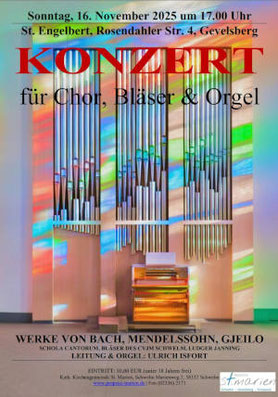 Am Sonntag, den 16.11.25 um 17:00 Uhr findet ein Geistliches Konzert mit Musik der Romantik in der neu renovierten St. Engelbertkirche mit Werken von Mendelssohn, Bruckner, Gjeilo und Hildenbrandt. Ausführende sind die Schola Cantorum, Bläser des CVJM Schwelm, Ludger Janning. Die Leitung hat Kantor Ulrich Isfort. Der Eintritt beträgt 10 EUR.
